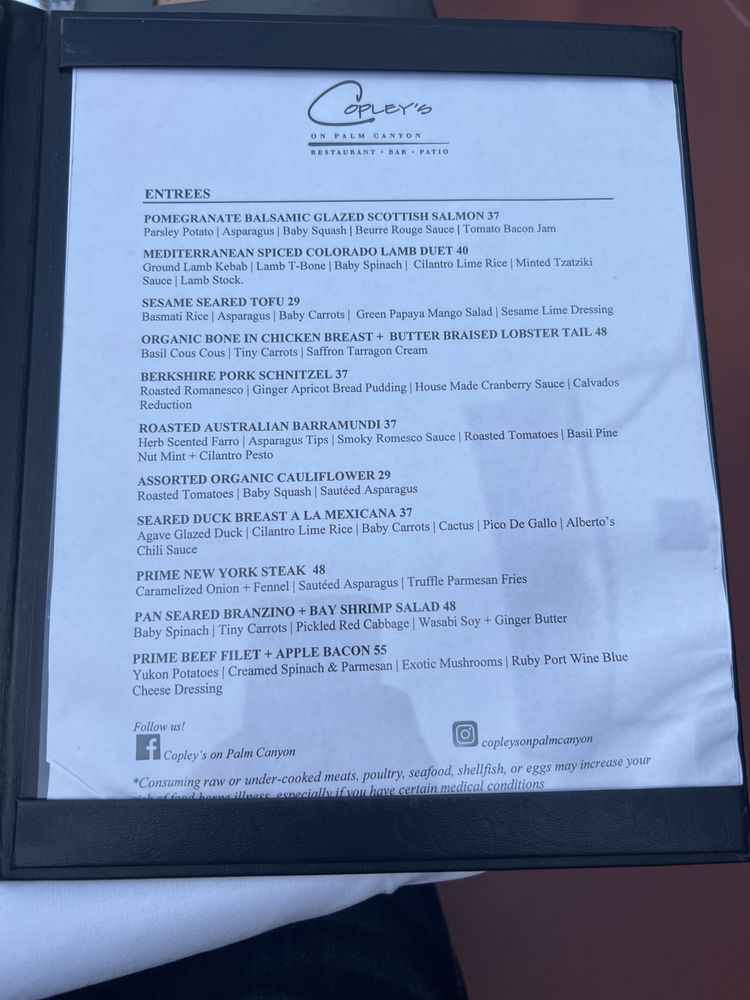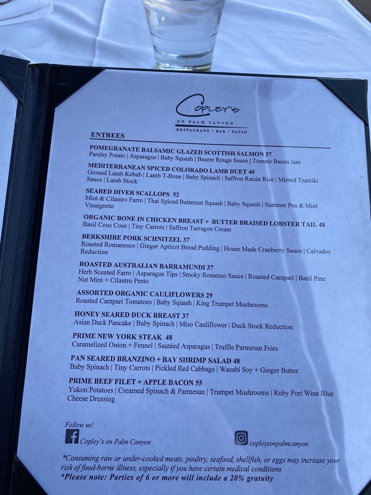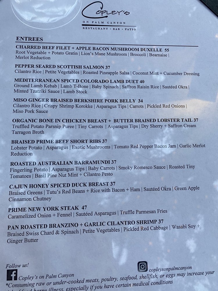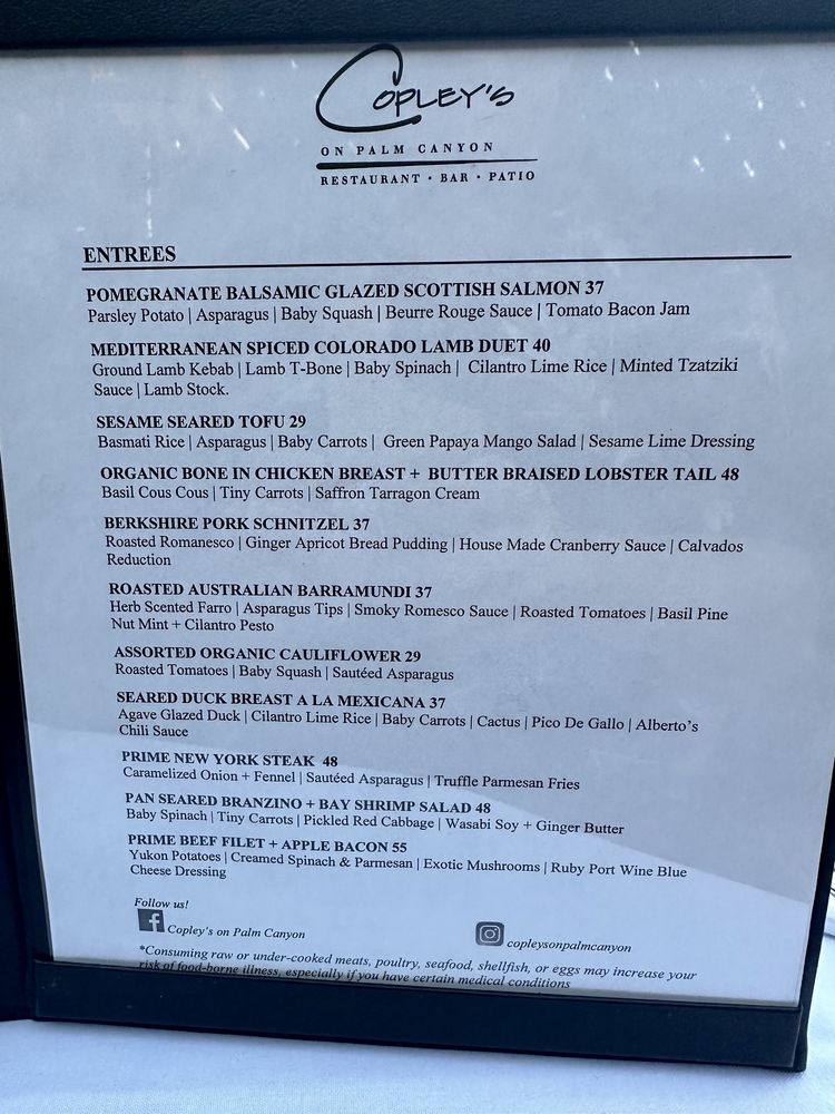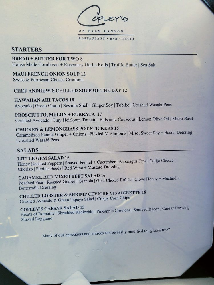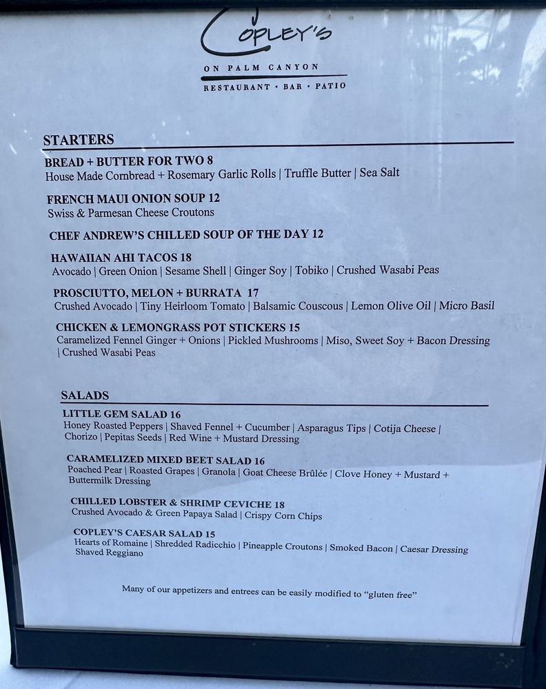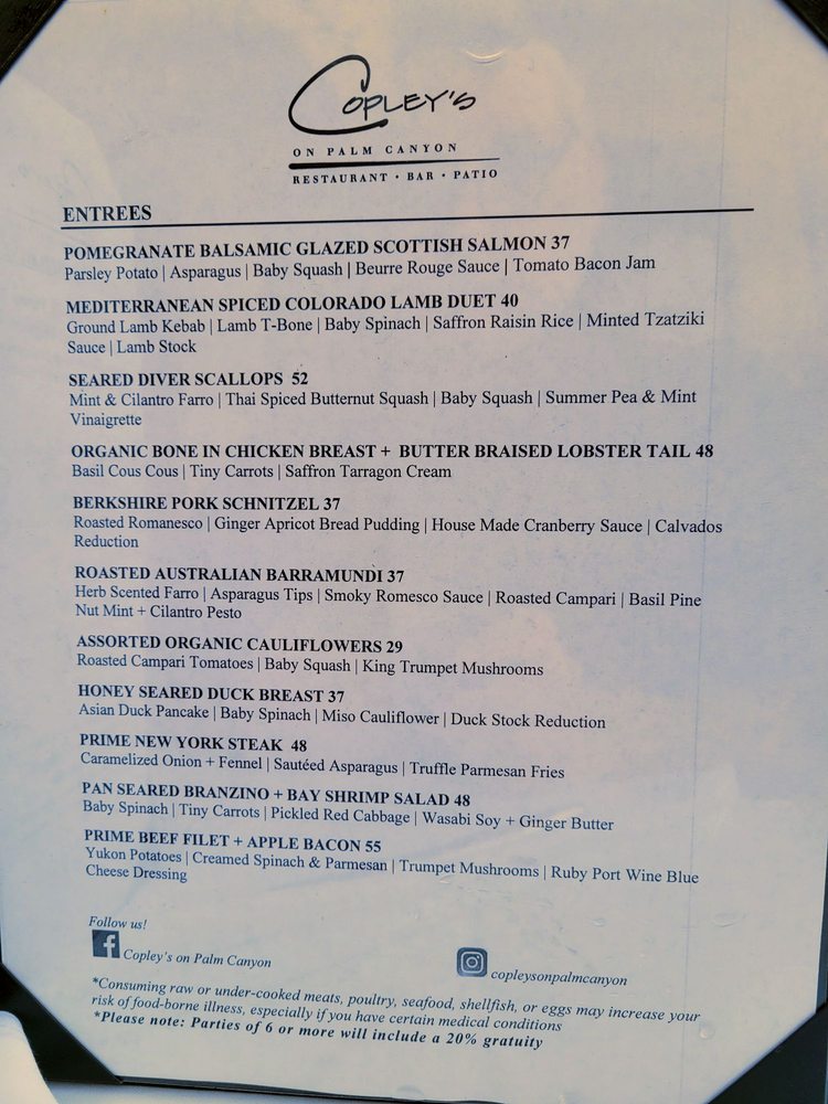 Copleys, located in Palm Springs, is a wine bar and New American restaurant known for its exceptional food, service, wine selection, and ambiance. The restaurant offers a romantic, classy atmosphere with options for outdoor seating or indoor dining. Customers praise the cozy and lovely setting of Copleys, making it a go-to spot for celebrations or a night out. The menu features pescatarian and vegan options, with dishes like lemon potstickers and a delicious Caesar salad. The historic setting, once Cary Grant's guest quarters, adds to the charm of the dining experience. The staff provides top-notch service, making guests feel welcome and satisfied. Overall, Copleys is a must-visit for those seeking a memorable dining experience in Palm Springs.